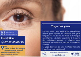 Plongez dans une expérience revitalisante conçue pour apaiser et renforcer vos yeux fatigués par les écrans, le stress et la fatigue quotidienne : cet atelier vous invite à découvrir des techniques simples et efficaces pour améliorer votre vision et favoriser la relaxation oculaire.